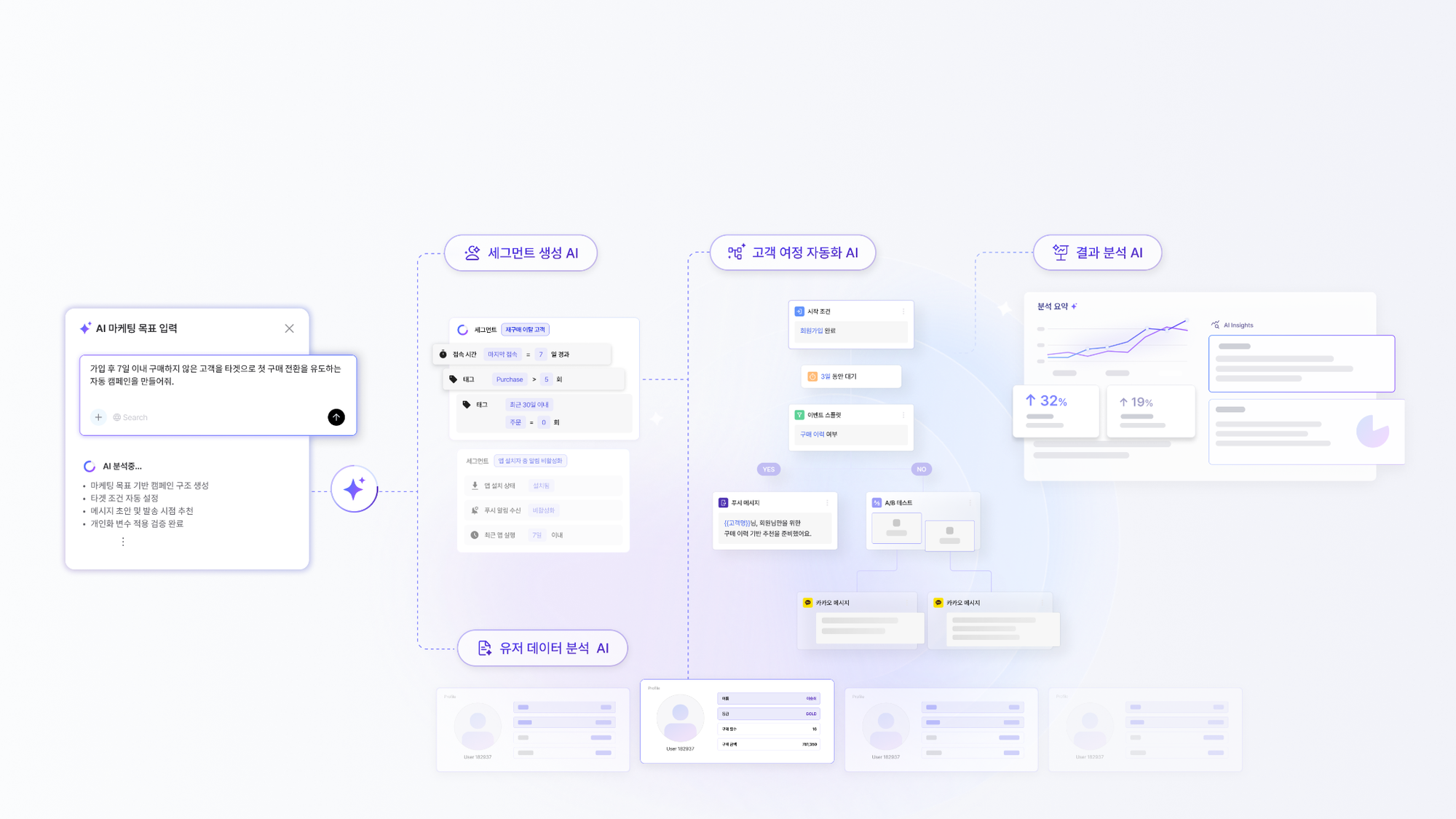- 목표 중심의 캠페인 설계: "가입 후 7일 이내 구매하지 않은 고객을 타겟으로 첫 구매 전환을 유도하는 자동 캠페인을 만들어줘"와 같은 명확한 마케팅 의도만 전달하면 AI가 즉시 분석에 착수하여 캠페인 구조를 생성합니다.
