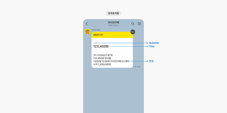 강조 표기형: 메시지 말풍선 상단에 타이틀과 부제목을 강조하여 주요 정보를 전달하며, iOS와 안드로이드에서 각각 최대 2줄로 제한되며, 예시는 다음과 같습니다: