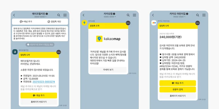 - 알림톡: 전화번호만 있으면 발송 가능하며, 고객의 카카오톡 채널 추가 여부와 무관