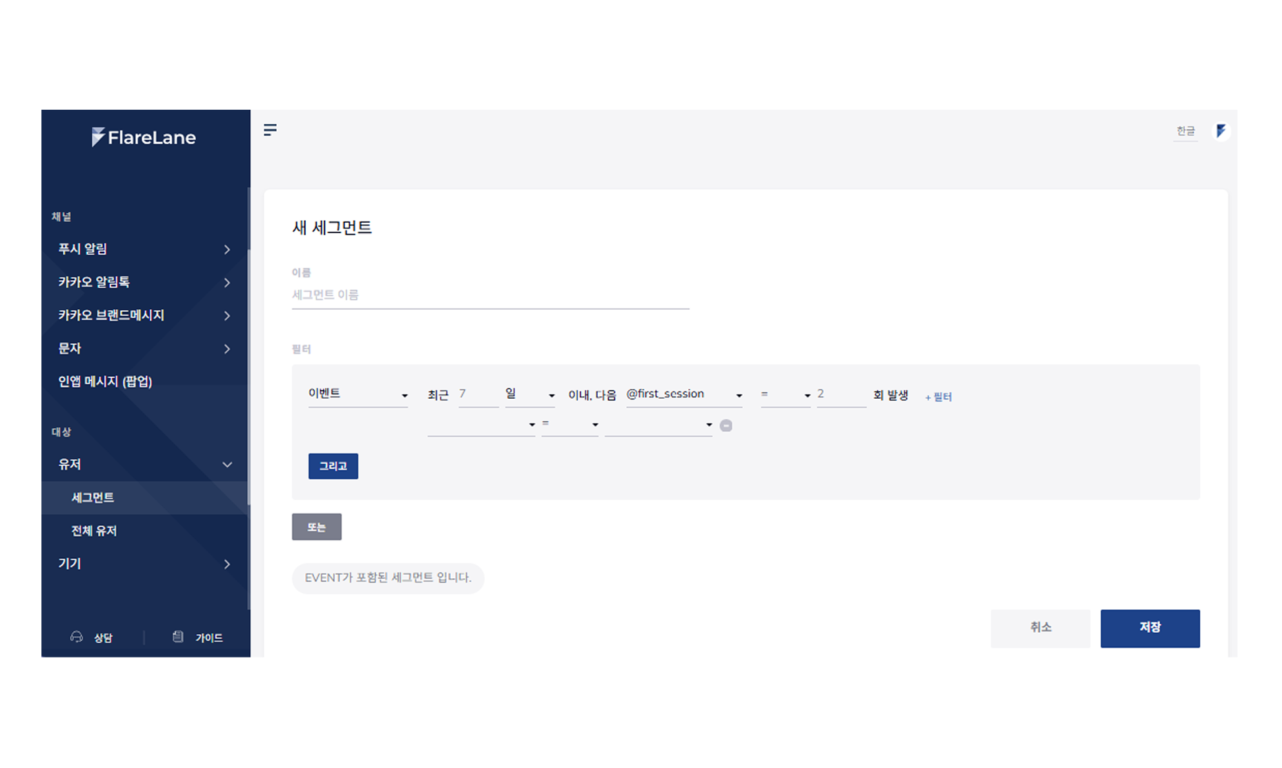 플레어레인의 세그먼트 기능은 고객의 행동과 속성에 따라 그룹을 나누고, 각 그룹에 가장 적합한 메시지를 보내는 데 핵심 역할을 합니다. 예를 들어 특정 상품을 반복적으로 조회한 고객, 최근 구매가 없는 고객, 특정 이벤트 (쿠폰 사용 등)를 실행한 고객 등 다양한 조건을 조합해 타겟 그룹을 자유롭게 만들 수 있습니다.