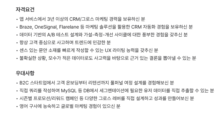- A/B 테스트 설계 및 해석: 캠페인의 효과를 과학적으로 검증하기 위해 A/B 테스트를 설계하고, 테스트 결과의 통계적 유의미성 여부를 판단하여 실제 액션으로 연결할 수 있어야 합니다.