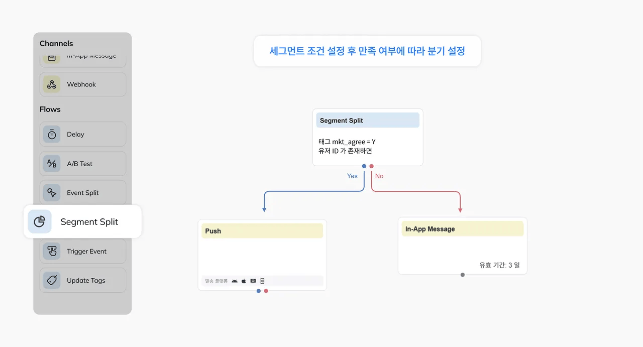 - 다양한 채널 연동: 인앱 메시지, 푸시 알림, 이메일 등 크로스 채널 연동을 통해 고객 여정을 원활하게 만들고, 일관된 메시지를 전달할 수 있습니다. 예를 들어, 푸시 알림을 통해 특정 이벤트를 알리고, 인앱 메시지를 통해 이벤트 참여를 바로 유도하는 방식으로 활용 가능합니다.
