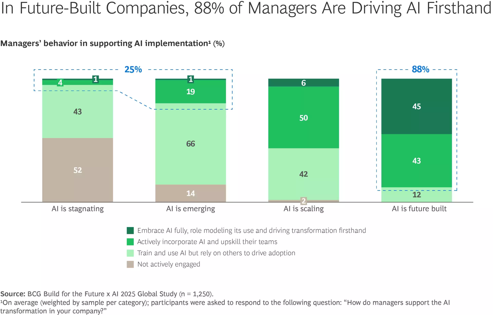 AX는 기술적 변화를 넘어선 문화적 변화를 요구하지만, 많은 조직이 구성원들의 컨센서스를 간과합니다. 대부분의 실무자들은 AI를 자신의 전문성을 강화해 줄 파트너 정도로 인식하고 있으며, 구조적으로 AI를 전 업무에 도입하는 순간 오히려 업무 부담을 가중시키는 방해물로 인식하게 됩니다. 실제로 매킨지(McKinsey)의 보고서에 따르면, 성공적인 AX의 비밀은 기술이 아닌 조직 구성원의 수용도와 변화 관리 (Change Management)에 있다고 하였습니다. 적절한 동기부여와 재교육 과정 없이 도구의 사용만을 강요하는 문화에서는 직원들이 기존의 관행을 고수하게 되며, 결과적으로 막대한 자본이 투입된 시스템은 사장될 수밖에 없는 것입니다.