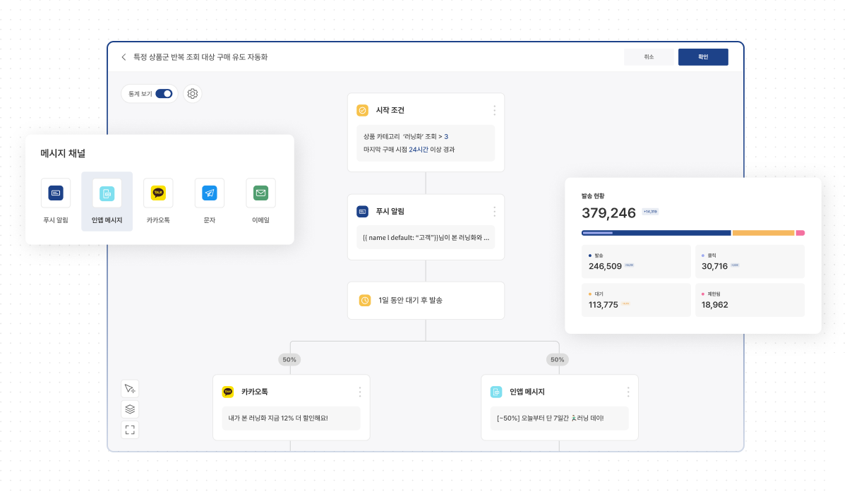 수동 발송 방식으로는 고객의 최근 방문일, 구매 이력, 장바구니 적재 여부와 같은 가변적인 데이터를 발송 시점에 즉각 반영하기가 매우 어렵습니다. 담당자가 엑셀로 명단을 추출하고 검토하는 사이에도 고객의 상태는 계속해서 변하기 때문입니다. 반면 자동화 솔루션을 활용하면 특정 조건을 충족하는 고객 군을 실시간으로 생성하고 유지할 수 있습니다.