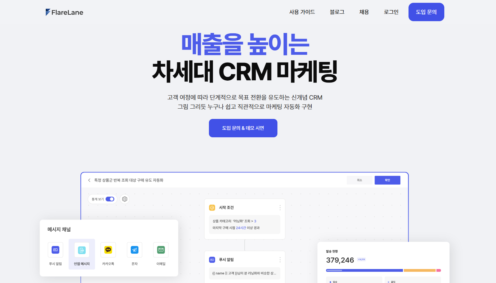 "일반적으로 CRM 솔루션은 마케팅 자동화 영역과 영업 관리(Sales CRM) 영역 두 가지로 나누어집니다. 마케팅 자동화는 고객 세그먼트 기반 캠페인 운영, 개인화 메시지 발송, 고객 여정 자동화 등을 담당하며, 영업 관리는 리드 관리와 파이프라인 관리에 초점을 둡니다. 플레어레인은 이 중에서 다채널 마케팅 자동화를 담당하는 CRM 솔루션으로, 푸시·인앱·웹푸시·카카오 비즈메시지 등 다양한 채널을 통합해 고객 커뮤니케이션을 고도화합니다."